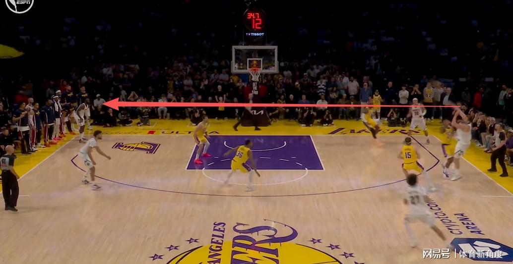 下一个回合,约基奇再次展现出其令人惊叹的球场视野。湖人队几乎将全部防守资源都集中于约基奇身上,将其逼至右侧边线位置。但约基奇一记超远距离大对角传球,精准传至底角的哈达威手中,后者命中三分,掘金队再次反超比分。
